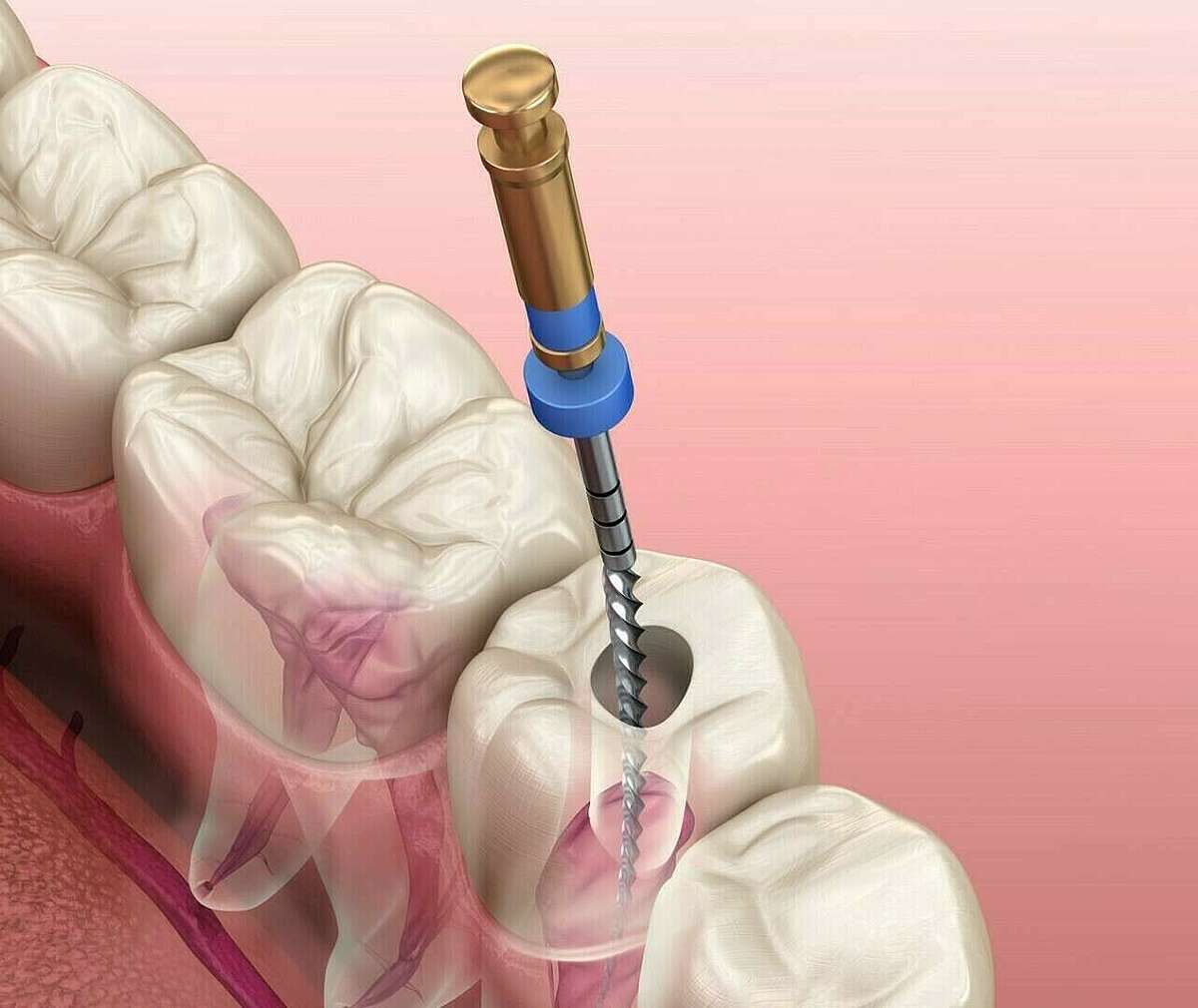 > Nouvelle obturation : une fois bien nettoyé et désinfecté, le canal à l’intérieur de la racine est obturé à l’aide d’une pâte étanche.